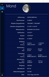 Astro Sun Moon zeigt die aktuellen Daten von Sonne und Mond, Astrodatum und Sternzeichen an. Die App beinhaltet zudem einen Sonnen- und Mondkalender mit den Daten für Aufgang, Kulmination, Untergang, Sonnen- und Mondscheindauer, sowie Mondphasen der nächsten 30 Tage. In einer zusätzlichen Ansicht kann die Position von Sonne und Mond grafisch angezeigt und deren Bewegung während des aktuellen Tages animiert werden.