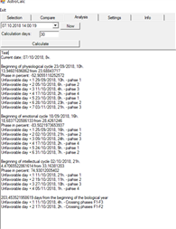 Astrology calculations, based on selected horoscope data. Horoscope analysis: - Graphically printed astrocard - Magnetism(compact information about selected date) - Transits analysis against planets and houses of selected date (planets & fixed stars transitions) - Calculates primary astrological directions (mundane, zodiacal), against house angels, planets, parallels, etc... - Planets & Houses analysis. - Planets detail analysis. - Biorhythm calculation Two horoscopes compare analysis: - Graphically printed astrocard (both, each other) - Planets & Houses compare analysis - Planets compare detail analysis. - Biorhythm compare calculation