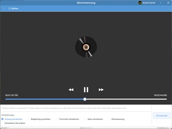 Gesangstrennung:Trennen Sie Klang-/Gesangs-/Begleitungs-/Schlagzeug-/Bass-/Klavier-Soundeffekte von einem Audio.