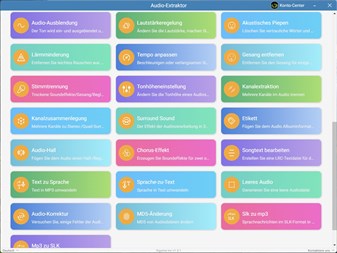 Die App umfasst Funktionen wie Online-Extraktion,Audio-Extraktion,Transkodierung,Formatumwandlung,Zuschneiden,Verketten,Teilen,Mischen,Exportieren von Sprachnachrichten,Ausblenden,Lautstärkeanpassung,Piepen,Tempo ändern,Rauschunterdrückung,Gesangsentfernung,Tonhöhe ändern,Kanäle extrahieren,Kanäle zusammenführen,Surround-Sound,Audio-Tag und Album-Cover,Audio-Hall, Textbearbeitung,Klingelton erstellen.
