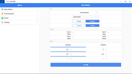 Features - Singles, Doubles - Record team event - 1 game, 3 games (1game = 21 points) - Analysis graphs - Share matches on Twitter, Email - Offline support