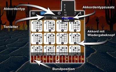 App Eigenschaften: - Anzahl der Akkorde: 8,000, - Unterstützung für die Banjos mit 5- und 4-Saiten, - Die Möglichkeit, jeden angezeigten Akkord abzuspielen, - Ausgewählte Akkord-Diagrammen via Drag&Drop zu Editoren hinzufügen (für die Kreation Ihrer eigener Lieder), - 56 Unterstützte Akkordtypen: Maj, Maj 6, Maj 7, Maj 9, Maj 11, Maj 13, Maj Maj7, Maj Add9, Min, Min 6, Min 7, Min 9, Min 11, Min 13, Min Maj7, Min Add9, Dim, Dim 6, Dim 7, Dim 9, Dim 11, Dim 13, Dim Maj7, Dim Add9, Aug, Aug 6, Aug 7, Aug 9, Aug 11, Aug 13, Aug Maj7, Aug Add9, Sus2, Sus2 6, Sus2 7, Sus2 9, Sus2 11, Sus2 13, Sus2 Maj7, Sus2 Add9, Sus4, Sus4 6, Sus4 7, Sus4 9, Sus4 11, Sus4 13, Sus4 Maj7, Sus4 Add9, 5, 5 6, 5 7, 5 9, 5 11, 5 13, 5 Maj7, 5 Add9, - Die authentische Banjo-Akkord-Klänge, - Zur Verfügung stehen alle gängigen Stimmungen: 1. Open G (5 String), 2. Standard C (5 String), 3. Open D (5 String), 4. Old-Time D (5 String), 5. Open A (5 String), 6. Plectrum (4 String), 7. Chicago (4 String), 8. Tenor (4 String), 9. Open C (5 String), 10. Double C (5 String), 11. Sawmil (5 String), 12. Guitar (5 String), 13. Willie Moore (5 String), 14. Doc Bog's D (5 String), 15. Cumberland Gap (5 String), 16. G Minor (5 String), - Unterstützung für die Linkshänder, - Lautstärkeregelung.