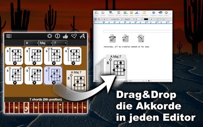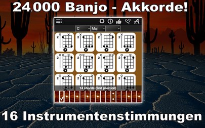 App Eigenschaften: - Anzahl der Akkorde: 24.000, - Unterstützung für die Banjos mit 5- und 4-Saiten, - Die Möglichkeit, jeden angezeigten Akkord abzuspielen, - Ausgewählte Akkord-Diagrammen via Drag&Drop zu Editoren hinzufügen (für die Kreation Ihrer eigener Lieder), - 56 Unterstützte Akkordtypen: Maj, Maj 6, Maj 7, Maj 9, Maj 11, Maj 13, Maj Maj7, Maj Add9, Min, Min 6, Min 7, Min 9, Min 11, Min 13, Min Maj7, Min Add9, Dim, Dim 6, Dim 7, Dim 9, Dim 11, Dim 13, Dim Maj7, Dim Add9, Aug, Aug 6, Aug 7, Aug 9, Aug 11, Aug 13, Aug Maj7, Aug Add9, Sus2, Sus2 6, Sus2 7, Sus2 9, Sus2 11, Sus2 13, Sus2 Maj7, Sus2 Add9, Sus4, Sus4 6, Sus4 7, Sus4 9, Sus4 11, Sus4 13, Sus4 Maj7, Sus4 Add9, 5, 5 6, 5 7, 5 9, 5 11, 5 13, 5 Maj7, 5 Add9, - Die authentische Banjo-Akkord-Klänge, - Zur Verfügung stehen alle gängigen Stimmungen: 1. Open G (5 String), 2. Standard C (5 String), 3. Open D (5 String), 4. Old-Time D (5 String), 5. Open A (5 String), 6. Plectrum (4 String), 7. Chicago (4 String), 8. Tenor (4 String), 9. Open C (5 String), 10. Double C (5 String), 11. Sawmil (5 String), 12. Guitar (5 String), 13. Willie Moore (5 String), 14. Doc Bog's D (5 String), 15. Cumberland Gap (5 String), 16. G Minor (5 String), - Unterstützung für die Linkshänder, - Lautstärkeregelung.
