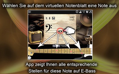 Der "Noten Explorer" hilft dir die Noten auf dem E-Bass in interaktive Art und Weise zu finden! Wenn du auf dem virtuellen Notenblatt eine Note wählst, so zeigt dir die App wo diese Note auf dem E-Bass zu finden ist und umgekehrt, durch das Klicken die Saiten auf E-Bassgriffbrett erhalten Sie die entsprechende Note angezeigt und der entsprechende Klang wird automatisch abgespielt.