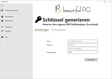 beautiful PG ist ein einfaches Tool, das die 5 Grundfunktionen von PGP hat. Es ist das einzige PGP-Programm das reinen Text verarbeitet. beautiful PG benötigt keinen Zugriff auf Keystores, das Dateisystem oder das Internet.