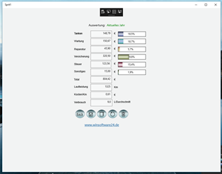 Fahrzeugkosten (PKW) erfassen und auswerten. Erfassen Sie die Ausgaben für Ihr Fahrzeug pro Jahr und sehen Sie, welche Kosten Ihnen insgesamt oder pro Km entstehen. Die Auswertung zeigt Gesdamtkosten, Ausgaben nach Kostenarten und die prozentualen Anteile der verschiedenen Kosten. Auswertung jederzeit speichern, Fehlbuchung rückgängig machen. Neue Buchungsperiode beginnen.