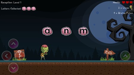 Mild mannered Bernard, English teacher extraordinaire, was zombified in a horrible incident involving a military experiment, An incident so top secret not even Bernard knows what happened. All we can tell you is Bernard's desire to eat brains is only matched by his compulsion to carry on making sure spelling lessons continue. Avoid the sickly sweet children as they will suck the life out of Bernard, avoid the hazards in the form of spinning candy and spikes as they will hurt. Look for the brains with the letters on them...be sure to collect them in the right order so that Bernard can spell the words out properly.