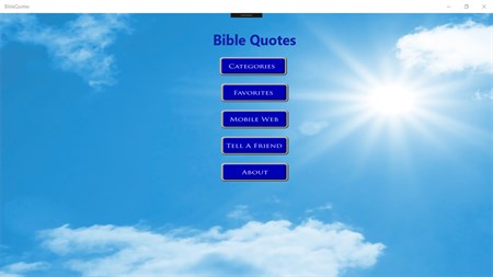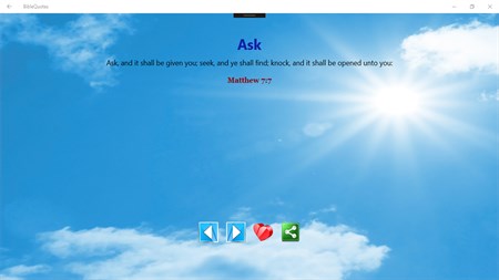 1. Categories for the different verses. 2. Verses Sharing facility on Social Media, Mail, SMS. 3. Ability to mark your favorite verses and browse through your favorite verses. 4. Over 1000 select Verses. 5. Share the App with your friends through our app sharing feature.