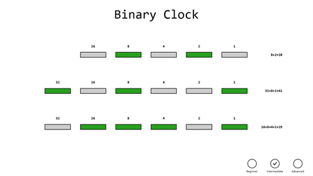 Binary Clock. Learn how to read it. It includes a "beginner" mode where a digital clock and captions helps you to understand the binary watch. Then you can go to the "intermediate" level where the digital clock is not sowed anymore but captions including the hours, minutes and seconds remain and finally go for the "advanced" where just the binary clock is alive