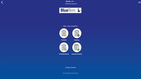 Zudem ist es möglich eine Objektbegehung durchzuführen und Räume zu erfassen. Es können Fotos und Bemerkungen erfasst und hinterlegt werden. Außerdem ist es möglich das Protokoll vom Kunden unterschreiben zu lassen. Die App ist nur benutzbar in Verbindung mit der BlueTem-Software und wenn das zugehörige Qualitätsmanagement-Modul erworben ist. Diese App basiert auf der QMS (PRO) Version.