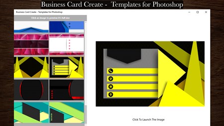 1. Select the template you want on the left side of the app. 2. The image preview of the template you chose will appear on the screen. 3. [ Click To Launch The Image ] to launch the template on Photoshop. 4. Using Photoshop, add the information you want on your card and it's done.
