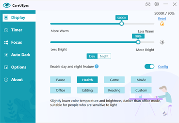 CareUEyes can help you stay healthy while using your computer, and it may very well increase your productivity too. It ensures that you take regular breaks while working, and it also enables you to customize your monitor’s color temperature to reduce the amount of blue light it generates