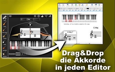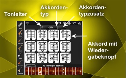 1 Tag GRATIS testen! Eine umfangreiche Akkord-Bibliothek mit über 250.000 Akkorden! Finden Sie die passenden Akkorde für Ihre Lieder auf allen gängigen Musikinstrumenten! Dank eines speziell entwickelten Algorithmus zeigt „Chords Compass“ Ihnen Akkorddiagramme mit allen möglichen Optionen in allen Positionen auf dem Musikinstrument Ihrer Wahl, auf der Tastatur oder im Griffbrett an. Wählen Sie einfach eine Taste auf der linken Seite, einen Akkord-Typ in der Mitte und einen Akkord-Typ auf der rechten Seite, und erkunden Sie die Akkorde mit „Chords Compass“! Das sagen unsere Benutzer zu einer früheren App, die wir in den Akkords Kompass aufgenommen haben: "Piano Chords Compass erfüllt seinen Namen - ein wirklich zuverlässiges KOMPASS für Lernen / Finden, Keyboard / Piano Akkorde. Durchdacht für den praktischen Einsatz konzipiert. Attraktive Schnittstelle. Ich habe die richtige Wahl getroffen. " App-Funktionen: - 257.400 Akkorde: - Klavierakkorde: 2.400 - Gitarrenakkorde: 100.000 Stücke - Bassgitarrenakkorde: 30.000 - Ukulele-Akkorde: 30.000 - Mandolinenakkorde: 30.000 - Banjo-Akkorde: 45.000 - Balalaika-Akkorde: 20.000 - Alle gängigen Musikinstrumente werden unterstützt: - Klavier - Gitarre: 6-saitig, - Bassgitarre: 4-saitig, 5-saitig und 6-saitig, - Ukulele: Sopran, Tenor, Bariton, Konzert und Sopranino, - Mandoline: Mandoline, Mandola und Mandocello, - Banjo: 5-saitig & 4-saitig, - Balalaika: 3-saitig. - Alle Musikinstrumente in der App sind miteinander verbunden, und dies gibt Ihnen die Möglichkeit, die Akkorde von einem Instrument zu einem anderen zu übertragen! - Sie können jeden angezeigten Akkord anhören. - Sie sehen die Akkorde als Noten und als Akkorddiagramme. - Sie können per Drag & Drop die ausgewählten. Akkorddiagramme in Editoren für Ihre eigenen Liederbücher kopieren. - Unterstützt 56 Akkordarten: Maj, Maj 6, Maj 7, Maj 9, Maj 11, Maj 13, Maj Maj7, Maj Add9, Min, Min 6, Min 7, Min 9, Min 11, Min 13, Min Maj7, Min Add9, Dim, Dim 6, Dim 7, Dim 9, Dim 11, Dim 13, Dim Maj7, Dim Add9, Aug, Aug 6, Aug 7, Aug 9, Aug 11, Aug 13, Aug Maj7, Aug Add9, Sus2, Sus2 6, Sus2 7, Sus2 9, Sus2 11, Sus2 13, Sus2 Maj7, Sus2 Add9, Sus4, Sus4 6, Sus4 7, Sus4 9, Sus4 11, Sus4 13, Sus4 Maj7, Sus4 Add9, 5, 5 6, 5 7, 5 9, 5 11, 5 13, 5 Maj7, 5 Add9. - Authentischer Klang für alle 7 Instrumente. - Unterstützung für Linkshänder. - Einstellbare Lautstärke. - Retina-Grafik. - Die App enthält alle gängigen Musikinstrumente: - Gitarre 1. Standard, 2. New standard, 3. Lute, 4. Half tone flat, 5. Whole tone flat, 6. Half tone sharp, 7. Whole tone sharp, 8. Drop B, 9. Drop C, 10. Drop D, 11. Double dropped D, 12. Celtic, DADGAD 13. DADADD, 14. Open A, 15. Open C, 16. Open D, 17. Open E, 18. Open G, 19. Slide open A, 20. Standard C, 21. Esus, 22. Drop C#, 23. Low C, 24. All Fourth, - Bassgitarre 1. Standard (4 String), 2. Standard (5 String), 3. Standard (6 String), 4. Tenor (5 String), 5. Alternative (6 String), - Ukulele 1. Soprano Standard, 2. Soprano C, 3. Sopranino Standard, 4. Sopranino New, 5. Tenor Low G, 6. Tenor New, 7. Baritone Standard, 8. Baritone Canadian, 9. Open A, 10. Open B, 11. Open C, 12. Open D, 13. Open E, 14. Open F, 15. Open G, - Mandoline 1. Mandoline Standard, 2. Mandola Standard, 3. Mandocello-Standard, - Banjo 1. Open G (5 String), 2. Standard C (5 String), 3. Open D (5 String), 4. Old-Time D (5 String), 5. Open A (5 String), 6. Plectrum (4 String), 7. Chicago (4 String), 8. Tenor (4 String), 9. Open C (5 String), 10. Double C (5 String), 11. Sawmil (5 String), 12. Guitar (5 String), 13. Willie Moore (5 String), 14. Doc Bog's D (5 String), 15. Cumberland Gap (5 String), 16. G Minor (5 String), - Balalaika 1. Akademisch 2. Traditionell