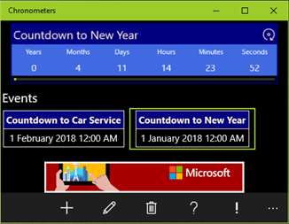 Do you need to know how much time there is to an event. This app provides countdowns to dates and times that you need to remember. For example, would you like help in remembering how much time there is until a birthday, car service, or a vacation. Any type of event can be added to Chronometers, all you need provide is a name and its date and time.