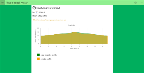 ● Calculation of TRIM and TSS online during cardio training with heart rate monitoring using a wearable sensor. At the same time, the calculation and monitoring of the model value of the lactate level in the blood and the moments of reaching the points anaerobic threshold and IPC. The calculated TRIM is recorded in the exercise log. The initial data are the duration training exercises and heart rate sensor track. To determine the model individual lactate profile of an athlete when calculating the training impulse, mathematical modeling is used based on the athlete's physiological avatar.
