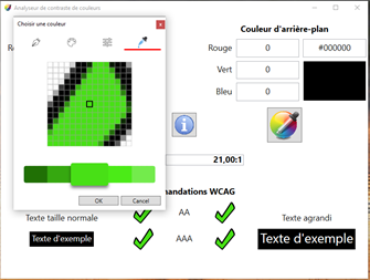 The purpose of the application is to calculate the contrast ratio between a foreground color and a background color, so that it can meet WCAG accessibility recommendations. Different possibilities are offered to choose the color (input of RGB components, HTML code, choice in a palette, "pipette" on the screen ...), the calculation of the ratio is automatic. Sample text using the chosen colors is provided. Icons directly indicate whether WCAG recommendations are met or not.