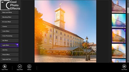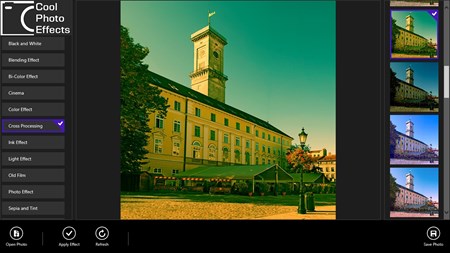 More than 300 original and exclusive effects for your photos ! Enhance your photos and apply professional finish with one click! Cool Photo Effects is very easy to use. Simply select an effect from the proposed categories: - Black and White - Bi-Color Effect - Blending Effect - Cinema - Color Effect - Cross Processing - Ink Effect - Light Effect - Old Film - Photo Effect - Sepia - Textures and Scratches - Vignette Apply multiple effects to create fantastic photos. You will like to grant your photo interesting and unique effects. The result will exceed your expectations.