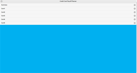 Credit Card Planner tracks up to 5 credit card balances and your monthly payments against them to give you an aggregate plan to paying them all off. Pay off those credit card!!
