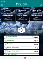 Display Jewish day's times of prayers and other times such as: midday ("Hatzot"), etc.. The times are displayed in the app and in addition - in the app's Tile (in the start menu). That is to say, Only the next time and all times after that will displayed at the app's tile. e.g. if the current hour is 12:00 am and the midday time is 12:40 am, so the midday("Hatzos") will displayed first and the next times will displayed after it. The times that displayed at the Tile shown only if they relevant to the specific day and hour.