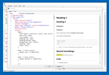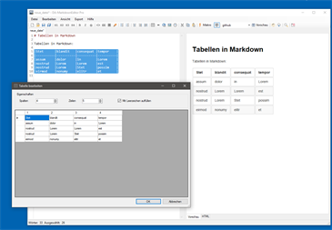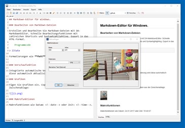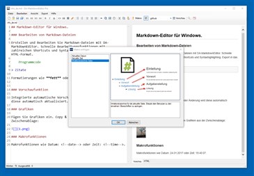Ein vollständiger Markdown-Editor für Windows. Bearbeiten und Erstellen Sie Markdown-Dateien mit DA-MarkdownEditor. Zahlreiche Helfer-Funktionen erleichtern die Arbeit. Fügen Sie z.B. Bilder direkt aus der Zwischenablage ein. Mit der integrierten Vorschaufunktion, sehen Sie jede Änderung in Echtzeit. Für den Export ins HTML-Format stehen verschiedene Designs zur Auswahl. Makrofunktionen erweitern die Markdown-Syntax, für die Erstellung von Inhaltsverzeichnissen. Mit dem Tabellen-Editor erstellen und bearbeiten Sie Tabellen.