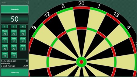 Erfasse deine auf eine reale Dartscheibe geworfenen Darts und lass die App für dich rechnen. Die Eingabe erfolgt komfortabel über die frei zoombare Darstellung einer Dartscheibe.