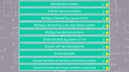 With Decimals - Fifth grade Math skills you can practice and improve the following math skills: - Add decimal numbers - Subtract decimal numbers - Multiply a decimal by a power of ten - Multiply a decimal by a one-digit whole number - Multiply two decimal numbers - Divide decimals by powers of ten - Division with decimal quotients - Divide decimals - Convert decimals to fractions and mixed numbers - Convert fractions and mixed numbers to decimals