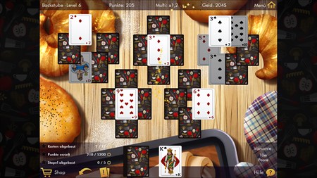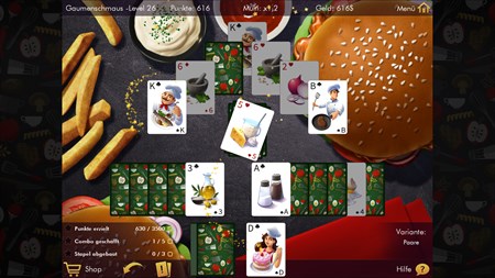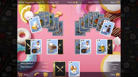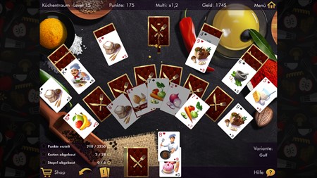 In „Delicous Solitaire“ werden Themen wie Gaumenschmaus und Küchenträume mit einem beliebten Kartenspiel geschickt kombiniert. Spielen Sie viele Solitaire-Level mit sehr appetitlich aussehenden Hintergründen frei und genießen Sie mit einem passenden Kartenset verschiedene Solitaire-Varianten. Das Programm ist für Anfänger ebenso geeignet wie für den geübten Solitaire-Spieler und bietet anspruchsvolles Spielvergnügen!
