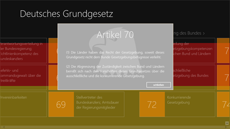 Das Grundgesetz für die Bundesrepublik Deutschland regelt die rechtliche und politische Grundordnung. In dieser App finden Sie alle Artikel übersichtlich aufgelistet. Es gibt eine komfortable Suchfunktion, die es Ihnen ermöglicht sowohl nach Begriffen als auch nach Paragraphen zu suchen.
