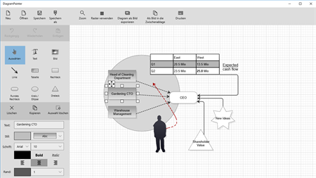 DiagramPainter ist eine App zum Zeichnen von Flussdiagrammen, Mind Maps, Organigrammen, und anderen Diagrammen. Mit ein paar Klicks kann man die erzeugen Diagramme dann in andere Apps und Programme integrieren. DiagramPainter exportiert ihre Mind Map, Flow-Chart oder andere Diagramme als .png, .jpg oder .bmp-Datei und kann diese auch drucken.