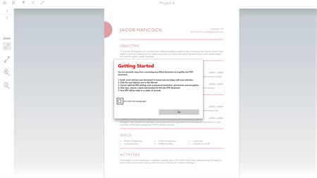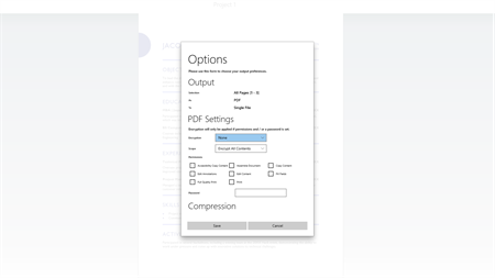 - Open Document to PDF Exporter. - Click New Project. - Select the desired Microsoft Word (doc, dot, docx, dotx, docm, dotm, rtf) file from the pop up file picker. - Use the built in viewer to navigate, pan and zoom the document. - Click Save to choose PDF export settings such as password protection, permissions and encryption. - Choose a file name and location and click Ok.