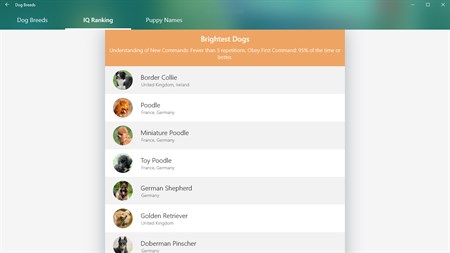 Dog Breeds database contain more than 360 dog breeds and their info. Dog lovers find a lot of useful information about their pets. Information about dog contain history, description, health, temperament, appearance.