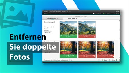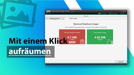 Machen Sie Schluss mit unnötigen Bildern - Mehr Speicherplatz dank DuplicateManager Photo verschenken Sie keinen teuren Speicherplatz mehr. - Mehr Zeit verschwenden Sie ihre wertvolle Zeit nicht mehr mit manueller Suche. - Bessere Übersicht dank smarter Duplicate-Finder-Technologie (exakte, doppelte oder ähnliche Bilder).
