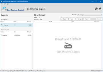 Dort Desktop Deposit enables members to make multi-check deposits to their accounts using any TWAIN, WIA or Ranger enabled scanner. The application has a user-friendly interface design and is especially designed for high-volume deposits and high-performance check scanners.