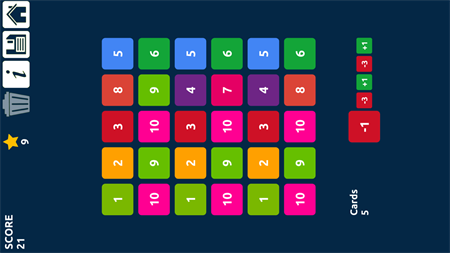 Simple rules: - Every match gives 1 star & 1 new card. - It costs 100 stars to remove a number from the grid using the delete button. - The game is over when you run out of cards and stars. - You can manually or automatically save your progress to resume it later.