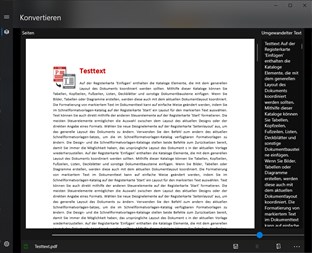Laden Sie PDF-Dateien über die Dateiauswahl, oder über das Kontextmenü des Windows-Explorer und konvertieren Sie diese zu Textdateien. Die App zeigt nach dem laden der Datei die grafischen PDF-Seiten an und konvertiert die Seiten automatisch in reines Textformat. Der konvertierte Text kann bearbeitet und als Textdatei gespeichert werden.
