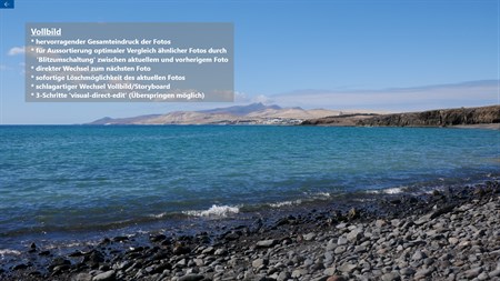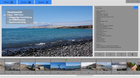 Vorteile: --------------------- * Storyboard mit bis zu 1000 Fotos * Import einzelner Fotos oder auch ganzer Ordner * schlagartiger Wechsel zwischen Storyboard- und Vollbildansicht * Originaldateien jederzeit einfach rückholbar * Horizontkorrektur mit 0.1° Genauigkeit/automatischer Zuschnitt * komfortabler manueller Zuschnitt in freien oder Festformaten * Helligkeits-, Kontrast- und Gammakorrektur * Korrektur der Farbsättigung * Korrektur von Farbtonabweichungen * Wandlung zu SW, sepia, vintage, ... * verschiedene Exportoptionen
