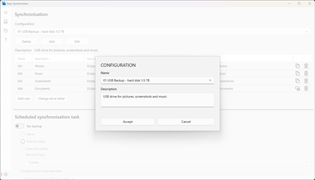 Easy Synchroniser is a simple but powerful application for comparing and synchronising folders. The software creates and manages backup copies of all your important files. The folders can be on different hard drives, on the network or on storage devices connected via the USB port.