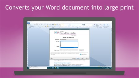 Convert your Word documents into the full range of alternative formats with EasyConverter Express. Make Braille, large print, MP3 and text only ePubs without any relevant expertise or experience. 3 simple steps convert your Word 2010, Word 2013, Word 2016, Word 2017, Word 2019 or Office 365 docs into your readers’ preferred accessible formats.