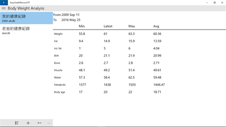 EasyHealthRecord RT can help you to record common values of body fat, blood pressure, blood glucose meters, and backup records to your network space.
