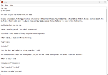 Eddy is a simple text editor with an AutoSave feature that can be used to open, create, and edit text files like .txt, .json, .log, or .csv format.