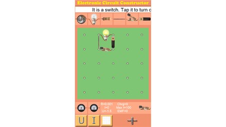 There are easily recognizable control elements in the main workspace of the app. The upper row contains six simple electronic elements: a motor, a resistor, a wire, a switch, a cell and a lamp. The elements are draggable and can be placed on dielectric plate attached to contact points.