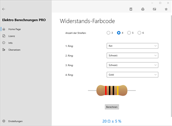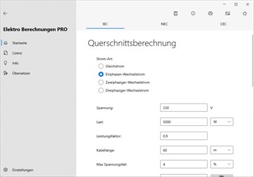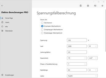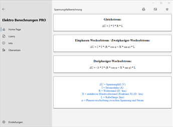 Hauptberechnungen: Querschnittsberechnung, Spannungsfallberechnung, Stromstärkeberechnung, Spannungsberechnung, Leistungsberechnung, Scheinleistungsberechnung, Blindleistungsberechnung, Leistungsfaktorberechnung, Widerstandsberechnung, Berechnung der Impedanz, Maximale Kabellänge, Strombelastbarkeit von isolierten Leitern [PRO], Strombelastbarkeit von blanken Leitern [PRO], Stromtragfähigkeit der Busbar [PRO], Kabelkanal-Dimensionierung [PRO], Dimensionierung des Leitungsschutzschalters [PRO], maximal zulässige Durchlassenergie des Kabels (K²S²) [PRO], Betriebsstrom, induktiver Blindwiderstand (Reaktanz X) [PRO], Impedanz aus Widerstand und Reaktanz [PRO], Leistungsfaktorkorrektur [PRO], Leistungsfaktorkorrektur von MS/NS-Transformatoren [PRO], Kondensatorleistung bei verschiedenen Spannungen [PRO], Erdungsvorrichtung, Maximaler Kurzschlussstrom [PRO], Minimaler Kurzschlussstrom, Kurzschlußstrom mit Umspannwerk [PRO], Leiterwiderstand, Berechnung der Kabeltemperatur [PRO], Leitungsverluste in Kabeln [PRO], Widerstands-Farbcode, Farbcode für Induktionsspulen, Kennfarben aus Widerstandswert, SMD Widerstands-Code, Kondensator-Farbcode, Induktivitäts-Code, Sicherungen, Parallel- und Reihenschaltung von Widerständen, Parallel- und Reihenschaltung von Kondensatoren, Resonanzfrequenz [PRO], Spannungsteiler [PRO], Stromteiler [PRO], Zenerdiode als Spannungsregler [PRO], Widerstand zur Spannungsverminderung, Vorwiderstand für LEDs, Batteriekapazität, Übertragungsfaktor Transformator, Antennenlänge, CCTV-Berechnung Speicherplatz/Bandbreite, Temperatursensoren (PT/NI/CU, NTC, Thermoelemente…) [PRO], Analog-Signal Verarbeitung [PRO], Joule Effekt, Risikobewertung von Überspannungen atmosphärischen Ursprungs (Blitzschutz) [PRO], Fehlerstrom von Solar-Strings [PRO].