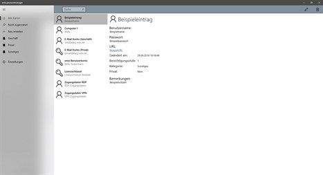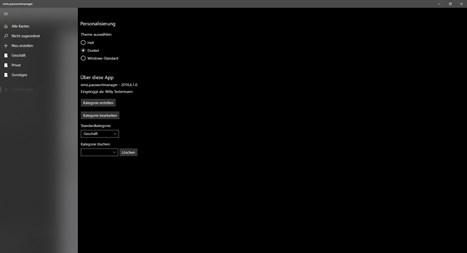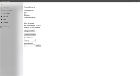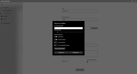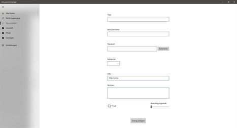 Es ist außerdem ein integrierter Passwortgenerator enthalten, welcher verschiedene Kombinationen anbietet, ein sicheres Passwort für Sie zu generieren. Sie können Ihre Einträge in Kategorien trennen, neue Kategorien erstellen, bearbeiten und löschen.
