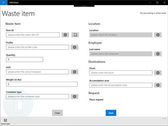 With the EMS.Waste app, your PC or tablet becomes a mobile hazardous waste tracking tool. Use EMS.Waste to track your consolidation and lab pack items into shipping containers, in and out of accumulation areas and on to manifests. Bulk waste material can be tracked in and out of tanks and accumulation areas and into shipping containers for manifesting. Tracking waste is easily performed with a few touches of the screen. Waste can also be tracked with barcode scanning technology. Scan your waste container barcodes with a barcode scanning device. EMS.Waste works with various wireless barcode scanning peripherals. Waste tracking data will be synced wirelessly between the EMS.waste mobile app and the EMS Waste web module.
