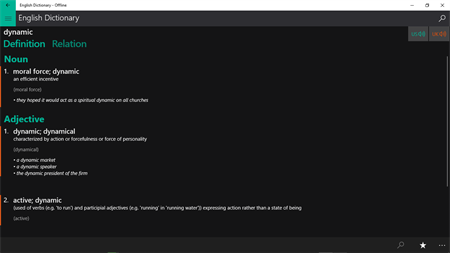 Dieses Offline-Wörterbuch erzählt über die grammatikalische Kategorie, Teile der Sprache, Synonyme, Hyponyme, Antonyme und Hyponyme mit Beispielen aus der realen Welt. Das Offline-Wörterbuch hat einen Vorschlags basierten Such-und Rechtschreib Prüf Algorithmus. Es hat eine schnellere und genaue Suche.