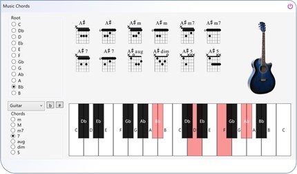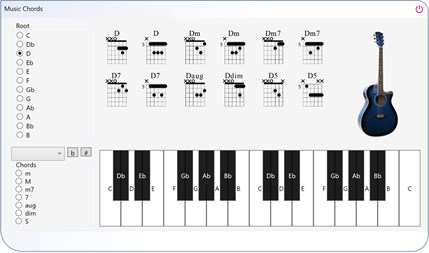 Essential Music Chords is a tool for both professional musicians and amateurs. It consists in the most commonly used piano chords and guitar chords. For any root note, you will find the Major, minor, m7, 7, augmented, diminished chords as well as power chords. The application comes with a virtual keyboard that shows the visual representation of the different chords and the musical notes that constitutes a given chord. Moreover, a lot of realistic sample sounds are bundled with the app. The sample sounds gather piano sounds as well as guitar sounds so that the user can play directly whatever melody he wants, on the virtual keyboard, at low latency.
