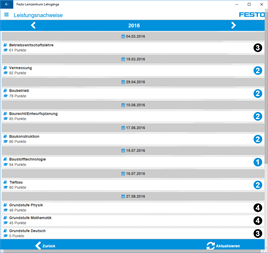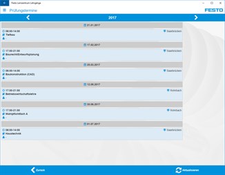 Diese App dient Lehrgangsteilnehmern des Festo Lernzentrums (z.B. Lehrgangsteilnehmer zur Erlangung des Abschlusses "Staatlich geprüfter Techniker" oder "Industriemeister") als Organisations- und Verwaltungshilfe sowie Informationstool. Der Teilnehmer kann hier u.a. Stundenpläne und seinen jeweiligen Schulungsort einsehen, seine Klausurnoten abfragen, oder per Push-Nachricht dringende Informationen erhalten.