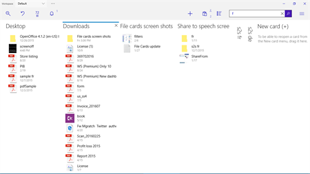 Instead of watching just one folder in Windows File explorer or two folders in 'Commander' apps, add as many cards as you wish and see your device at a glance. Create your own workspaces as a group of logically connected cards/folders to easily switch between various segments of your data. Searching through the workspace with File Cards tools (where you may enable to see items contained in all subfolders, or filter all the cards by the file type) is the quickest and most intuitive way to find the files as you organize data in the app exactly the way you think about them.