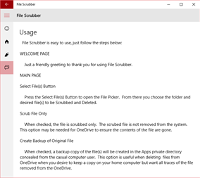 A simple App to scrub personal data from no longer needed files. App will over write your data from 10 to 15 times with random data before deleting the file. If a hacker is able to recover your file the hacker will find no usable data.