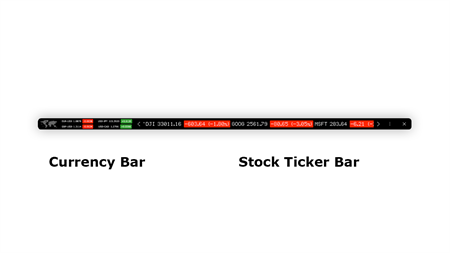This premium and high-quality Windows app shows on your desktop a dynamic infinite scrolling bar with the latest stock information: ◆ Real-time stock ticker information, initiating instantly like magic without the need for API codes ◆ Support for currency and cryptocurrency, such as Bitcoin ◆ Unleash your creativity by customizing every aspect of the toolbar, from colors (red, green, text) to the background, tailoring the display to your preferences ◆ Cater to the needs of Asia users with the option to invert red and green colors ◆ Seamlessly manage your stock portfolio with the ability to add, remove, or modify stocks at your convenience ◆ Choose between a dynamic scrolling bar and a static bar to suit your preferred viewing experience ◆ Fine-tune the speed ratio of the dynamic scrolling bar according to your preferences ◆ Expand your visibility with the option to show a second toolbar, ensuring you have all the information you need at a glance ◆ Keep the toolbar on top of all your windows with the "pin" option ◆ Optimize window placement with a single click for "top", "bottom", "full width", or in the "center" of your desktop ◆ Tailor the information displayed in the toolbar by choosing between "Percent", "Price", or "Market Capitalization" ◆ Adjust the toolbar's opacity seamlessly between 0% and 100% for a personalized visual experience ◆ Stay informed with notification messages when stocks reach specific values ◆ Easily access stock-related information with links to popular websites such as Yahoo, Google, Bing, CNN Money, and CNBC Stock Markets ◆ Embrace a sleek aesthetic with support for Dark Mode, ensuring a seamless and visually pleasing experience, day or night